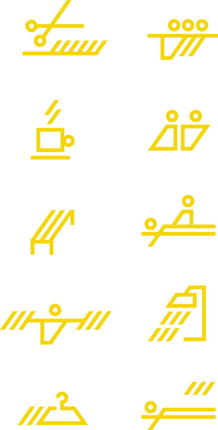 Для яркой навигации внутри клуба и на сайте создан набор фирменных пиктограмм. В их основе сочетание горизонтальных и вертикальных полос с фирменными диагоналями наклона 55° и окружностями фиксированного диаметра.
